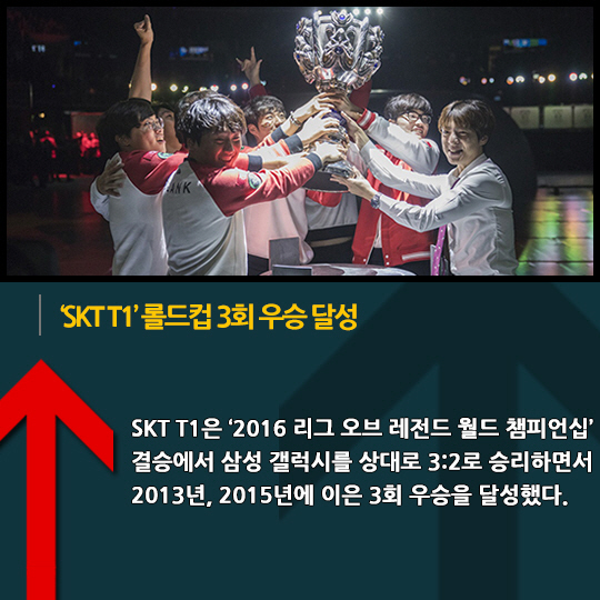 SKT T1은 '2016 리그 오브 레전드 월드 챔피언십'결승에서 삼성 갤럭시를 상대로 3:2로 승리하면서 2013년, 2015년에 이은 3회 우승을 달성했다.