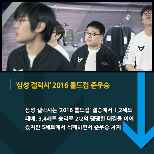 삼성 갤럭시는 '2016 롤드컵' 결승에서 1,2세트 패배, 3,4세트 승리로 2:2의 팽팽한 대결을 이어갔지만 5세트에서 석패하면서 준우승 차지