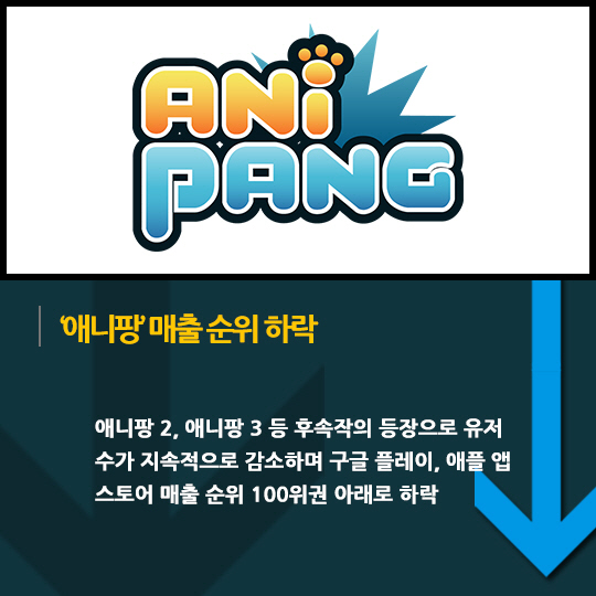 애니팡 2, 애니팡 3 등 후속작의 등장으로 유저 수가 지속적으로 감소하며 구글 플레이, 애플 앱스토어 매출 순위 100위권 아래로 하락