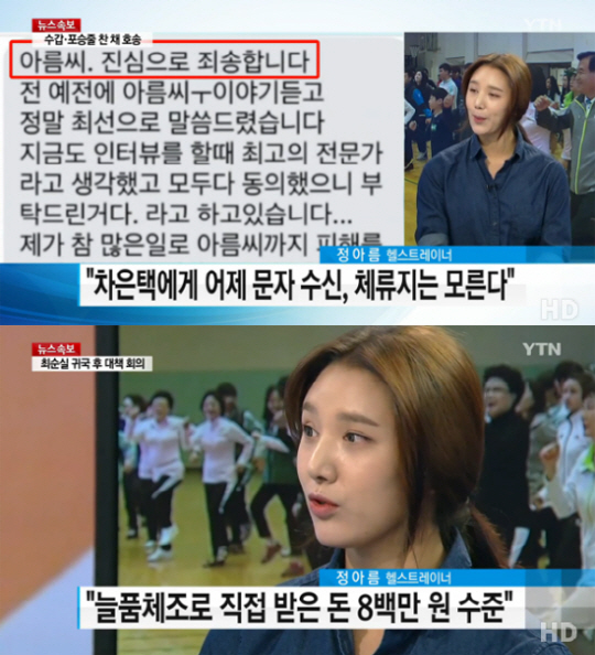 정아름은 자신이 '늘품체조'로 차은택 회사 쪽에서 받은 금액은 1500만원이라고 밝혔다. 이어 "안무가와 시연가들의 일당을 제외하고 제가 순수하게 가져간 돈은 800만원 정도다. 제가 하는 다른 일과 비교했을 때 그 금액은 큰 금액이 아니다"라고 말했다.