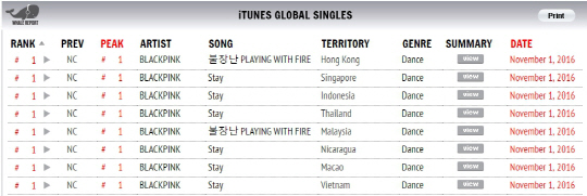 오늘(1일) 오후 3시 기준, 블랙핑크의 두 번째 디지털 싱글 'SQUARE TWO'의 더블타이틀곡 '불장난'과 STAY'는 홍콩, 말레이시아, 인도네시아, 마카오, 싱가포르, 태국, 베트남, 니카라과 등 총합 8개국 해외 아이튠즈 싱글 차트에서 1위를 차지하며 전세계적으로 뜨거운 인기를 과시했다.