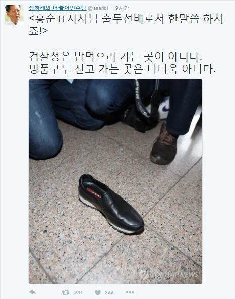 더불어민주당 정청래 전 의원은 자신의 트위터에 최순실의 구두 사진을 업로드하며 최순실을 향해 "곧 죽어도 명품 신발을 신는다"고 비난했다. 이어 "홍준표지사님 출두선배로서 한말씀 하시죠! 검찰청은 밥먹으러 가는 곳이 아니다. 명품구두 신고 가는 곳은 더더욱 아니다"라는 글을 남기기도 했다.