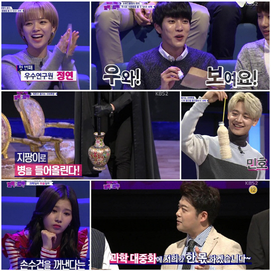 아이돌 뇌섹녀들도 속속 등장해 시청자들을 즐겁게 했다. 트와이스의 정연은 유리 책상과 암실을 투사의 원리로 정확히 맞춰 '우수연구원'으로 꼽혔다.