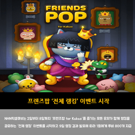 NHN픽셀큐브는 2일부터 8일까지 '프렌즈팝 for Kakao'를 즐기는 모든 유저가 함께 랭킹을 공유하는 '전체 랭킹' 이벤트를 시작하고 9일 랭킹 결과 발표에 따라 1등에게 루비 800개 지급
