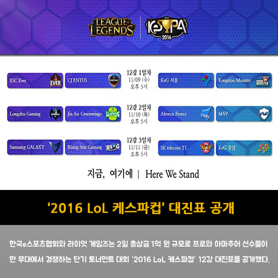 한국e스포츠협회와 라이엇 게임즈는 2일 총상금 1억 원 규모로 프로와 아마추어 선수들이 한 무대에서 경쟁하는 단기 토너먼트 대회 '2016 LoL 케스파컵' 12강 대진표를 공개했다.