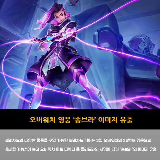 블리자드의 다양한 물품을 구입 가능한 블리자드 기어는 2일 오버워치의 23번째 영웅으로 출시될 가능성이 높고 오버워치 아트 디렉터 존 폴리도라의 서명이 담긴 '솜브라'의 이미지 유출