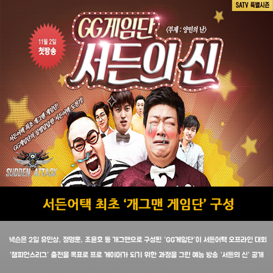넥슨은 2일 유민상, 정명훈, 조윤호 등 개그맨으로 구성된 'GG게임단'이 서든어택 오프라인 대회 '챔피언스리그' 출전을 목표로 프로 게이머가 되기 위한 과정을 그린 예능 방송 '서든의 신' 공개