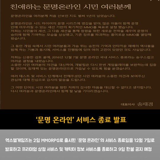 엑스엘게임즈는 2일 MMORPG로 출시된 '문명 온라인'의 서비스 종료일을 12월 7일로 발표하고 프리미엄 상점 서비스 및 캐릭터 정보 서비스를 종료하고 9일 환불 공지 예정