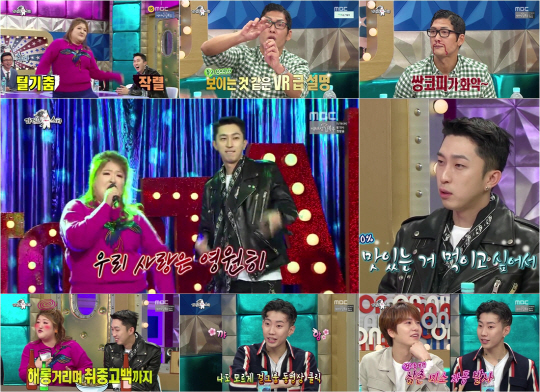 [스포츠조선 조윤선 기자] '라디오스타' 이국주-슬리피가 마치 '우결'의 실사판을 보는 듯한 찰떡궁합 부부케미를 뿜어내며 시청자들에게 큰 웃음을 선사했다. 이들은 스킨십 폭발했던 첫만남부터 현재진행형인 서로를 향한 속마음까지 예상치 못한 설렘을 안겨줘 시청자들의 마음에 불을 질렀다. 이와 더불어 해외파 박준형-박재범은 서툰 한국어 실력으로 웃음반란을 일으켰다.