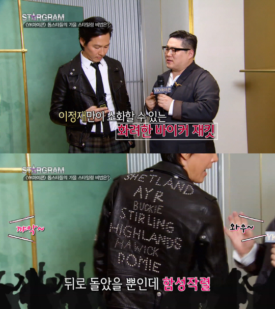 평소 수트, 포멀한 무드의 패션으로 여심을 저격했던 이정재는 댄디한 무드의 라이더 재킷룩을 선보였다. 화이트 셔츠, 체크 슬랙스, 타이로 댄디한 무드를 연출하고 거기에 라이더 재킷을 더해 스타일을 마무리했다.