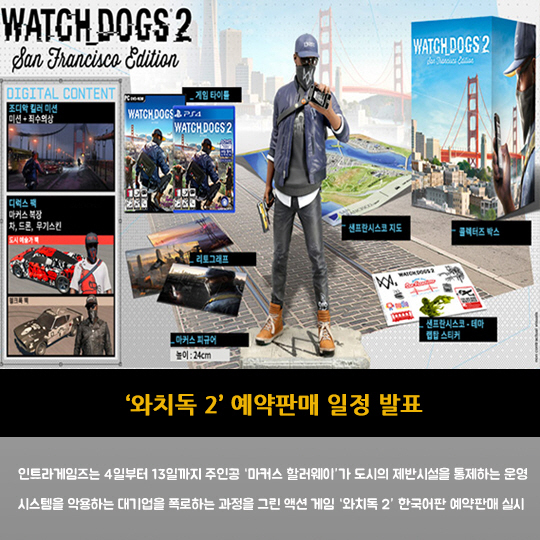 인트라게임즈는 4일부터 13일까지 주인공 '마커스 할러웨이'가 도시의 제반시설을 통제하는 운영 시스템을 악용하는 대기업을 폭로하는 과정을 그린 액션 게임 '와치독 2' 한국어판 예약판매 실시