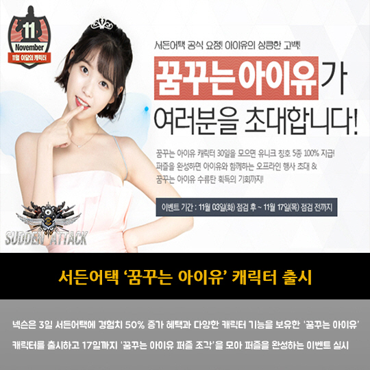 넥슨은 3일 서든어택에 경험치 50% 증가 혜택과 다양한 캐릭터 기능을 보유한 '꿈꾸는 아이유' 캐릭터를 출시하고 17일까지 '꿈꾸는 아이유 퍼즐 조각'을 모아 퍼즐을 완성하는 이벤트 실시