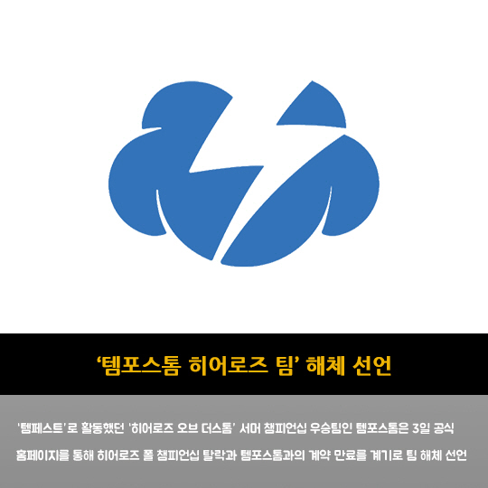 '템페스트'로 활동했던 '히어로즈 오브 더스톰' 서머 챔피언십 우승팀인 템포스톰은 3일 공식 홈페이지를 통해 히어로즈 폴 챔피언십 탈락과 템포스톰과의 계약 만료를 계기로 팀 해체 선언