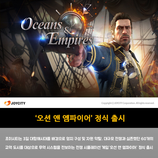 조이시티는 3일 대항해시대를 배경으로 영지 구성 및 자원 약탈, 대규모 전쟁과 실존했던 60개의 교역 도시를 대상으로 무역 시스템을 전보이는 전쟁 시뮬레이션 게임'오션 앤 엠파이어' 정식 출시