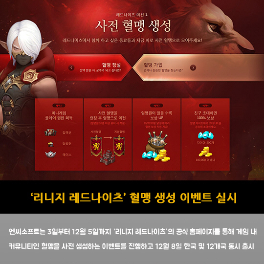 엔씨소프트는 3일부터 12월 5일까지 '리니지 레드나이츠'의 공식 홈페이지를 통해 게임 내 커뮤니티인 혈맹을 사전 생성하는 이벤트를 진행하고 12월 8일 한국 및 12개국 동시 출시