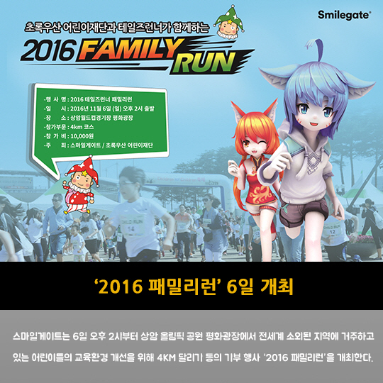 스마일게이트는 6일 오후 2시부터 상암 올림픽 공원 평화광장에서 전세계 소외된 지역에 거주하고 있는 어린이들의 교육환경 개선을 위해 4KM 달리기 등의 기부 행사 '2016 패밀리런'을 개최한다.