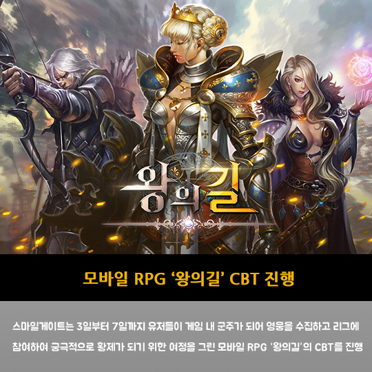 스마일게이트는 3일부터 7일까지 유저들이 게임 내 군주가 되어 영웅을 수집하고 리그에 참여하여 궁극적으로 황제가 되기 위한 여정을 그린 모바일 RPG '왕의길'의 CBT를 진행
