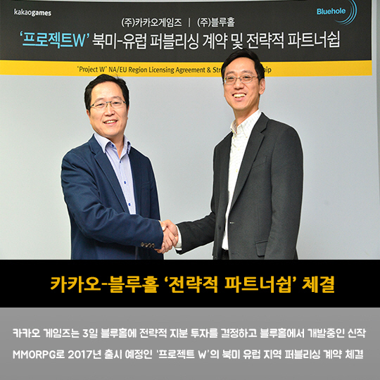 카카오 게임즈는 3일 블루홀에 전략적 지분 투자를 결정하고 블루홀에서 개발중인 신작 MMORPG로 2017년 출시 예정인 '프로젝트 W'의 북미 유럽 지역 퍼블리싱 계약 체결