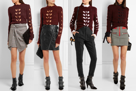 이자벨 마랑의 2016-17 컬렉션 쇼에서는 스트라이프 셔츠와 위쪽은 여유 있고 아래쪽으로 갈수록 통이 좁아지는 테이퍼드 실루엣의 체크 슬렉스와 함께 매치했습니다. 두꺼운 벨트와 버클 부츠까지 곁들여 클래식하면서도 매니시한 무드가 믹스된 스타일링으로 활용된 모습이랍니다. 태연은 과감하게 단품으로 선택, 숏 팬츠와 매치해 섹시 큐트 매력을 발산했습니다.