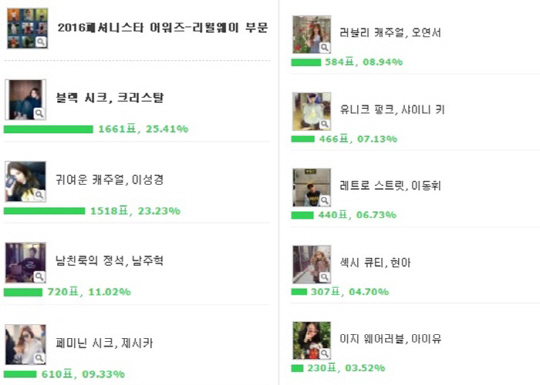 '2016 패셔니스타 어워즈-리얼웨이' 부문 투표에 참여한 네티즌들은 "크리스탈 이동휘. 진짜 리얼웨이에서도 빛나요", "다들 너무 부러운 비주얼과 패셔니스타!!", "현아언니~ 항상 개성있고 예쁜 스타일 좋아요! 앞으로도 음원대박나길♥", "와..지은이누나 옛날에 옷 못입는다고 소문났는데 ..이젠 옷잘입기로 소문나다니ㅠㅠ 팬으로써 너무 장한것 같다 ㅠㅠ" 등 본인이 생각하는 패셔니스타를 열렬 응원하는 모습을 보였다.