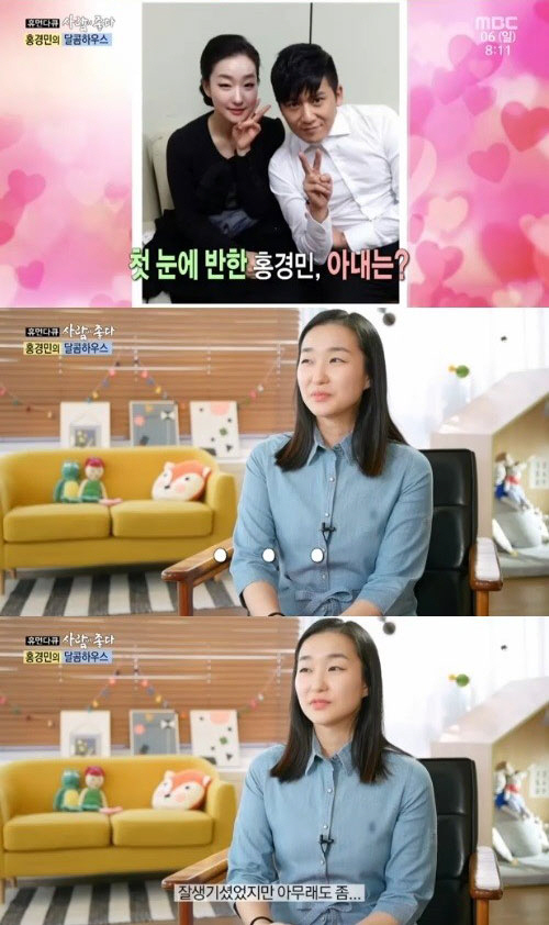 그러나 홍경민의 아내는 "남편에게 첫눈에 반했나"라는 질문에 수줍게 웃으며 "사실 좋아하는 연예인은 아니었다. 잘생기셨지만 아무래도 저는 피부가 좋은 연예인을 좋아했던 것 같다"고 솔직하게 털어놔 웃음을 자아냈다.