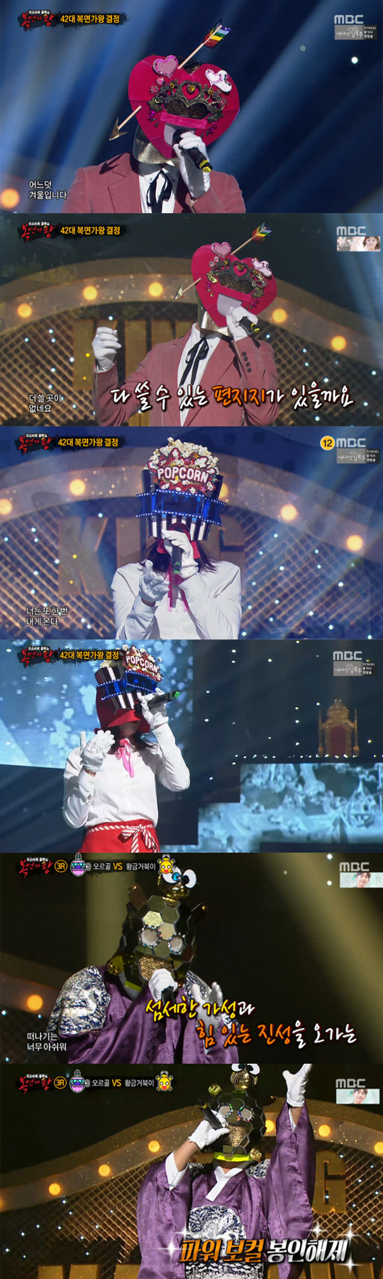 6일 MBC '일밤-복면가왕'에서는 현 가왕 '주문하시겠습니까 팝콘소녀'와 생방송 가왕 '심장어택 큐피드', '만수무강 황금거북이'의 가왕전이 방송됐다.