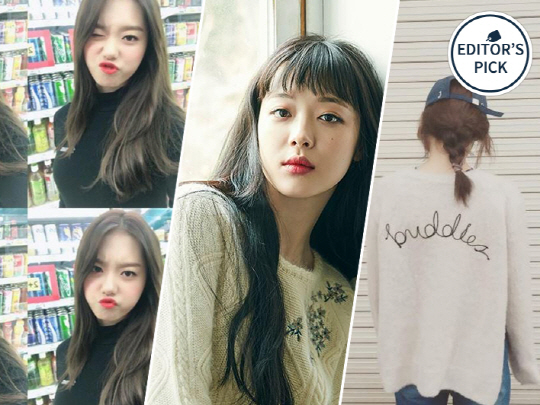 모두의 마음을 설레게 하는 미모의 설리! 그녀는 청순한 느낌의 아이보리 케이블 니트를 선택했습니다. 왼쪽 어깨 부분 플라워 패턴의 자수로 여성스러운 느낌을 더욱 배가시키네요. 베이직한 컬러로 어떤 하의와 매치해도 좋은 활용도 높은 제품입니다. 써스데이 아일랜드 제품.