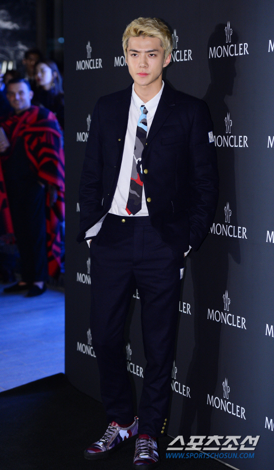 세훈의 밝은 헤어 컬러와 멋스러운 블랙 수트의 버튼 컬러가 환상의 조합을 보여준다. 세훈은 블랙 수트에 화이트 셔츠를 매치해 모범적인 스타일링을 선보였다. 모범적이지만 자칫 잘못하면 허전해 보일 수도 있는 룩에 카모 패턴의 넥타이와 슈즈를 매치. 세훈은 트렌디한 카모 스타일링을 완성시켰다.