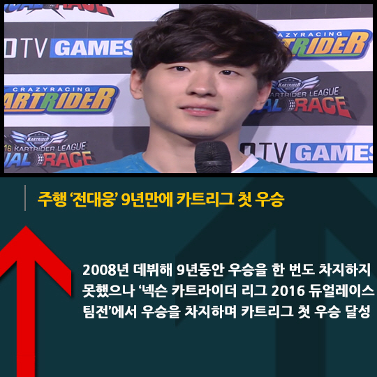 2008년 데뷔해 9년동안 우승을 한 번도 차지하지 못했으나 '넥슨 카트라이더 리그 2016 듀얼레이스 팀전'에서 우승을 차지하며 카트리그 첫 우승 달성