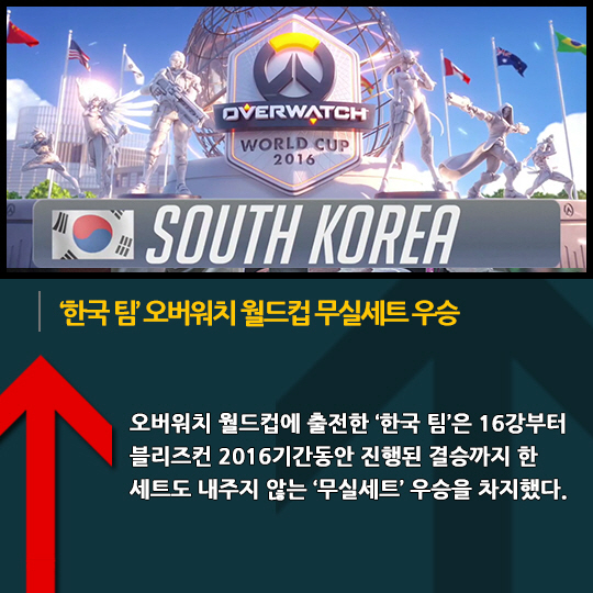 오버워치 월드컵에 출전한 '한국 팀'은 16강부터 블리즈컨 2016기간동안 진행된 결승까지 한 세트도 내주지 않는 '무실세트' 우승을 차지했다.