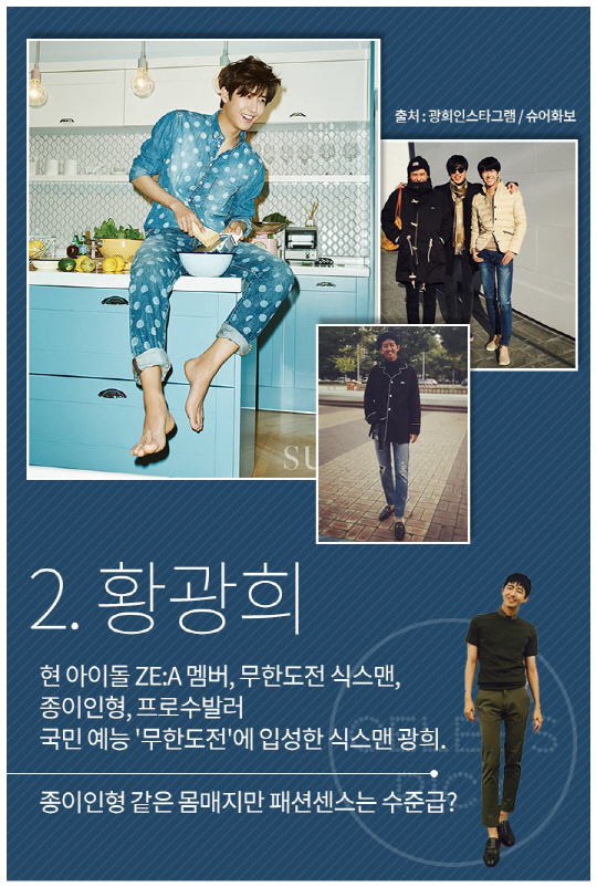 광희는 '무한도전' 멤버들 중 가장 트렌디하고 패셔너블한 스타일을 선보이며 젊은 감각을 대표한다. '종이인형'이라는 수식어로 놀림을 당하지만, 의외로 그의 패션 센스는 수준급이다. 절제된 핏의 팬츠, 디테일에 신경 쓴 수트 아이템들도 거뜬히 소화할 뿐 아니라 해외 국내 컬렉션을 막론하고 디자이너들의 아이템을 사랑하는 멋쟁이이기도 하다.