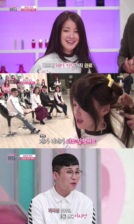 짧은 시간 안에 푸석푸석한 머릿결을 윤기 나는 헤어로 손쉽게 바꾸는 요령과 MC 이시영이 녹화도중 헤어 관리 시범을 보이기 위해 직접 헤어컷을 한 이유를