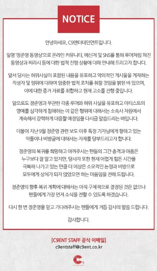 다시 한 번 정준영을 믿고 기다려 주시는 팬들에게 거듭 감사의 말씀 드립니다. 감사합니다.