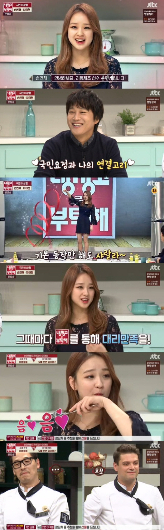 JTBC'냉장고를 부탁해' 104회에서는 손연재 등장에 환호하는 MC와 세프들의 모습이 유쾌하게 그려졌다. 특히 김성주는 손연재가 리우올림픽 5대 미녀에 뽑힌 사실을 언급했는데, 이에 안정환은 지금은 배가 나왔지만 2002년 자신도 베컴을 제치고 데이트 하고 싶은 스타 1위로 뽑혔었다고 말해 시청자들의 웃음을 자아냈다. narusi@sportschosun.com