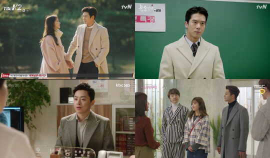 조정석과 서인국은 그레이 컬러 헤링본 울 코트로 멋을 냈다. 조정석은 드라마 '질투의 화신'에서 패턴이 있는 드레스 셔츠를 캐주얼한 가디건과 함께 매치하고 그 위에 그레이 컬러의 더블 코트로 무게감을 더했다. 노타이(no tie) 패션으로 자칫 너무 캐주얼해보일 수 있는 부분을 도톰한 소재의 울 코트로 마무리 했다. 서인국은 드라마 '쇼핑왕 루이' 속 장면에서 블랙 컬러의 터틀넥과 함께 매치해 샤프하면서도 분위기 있는 느낌을 자아냈다. 겨울철 멋은 물론 보온성까지 놓치지 않은 룩으로 따뜻함을 느낄 수 있다.