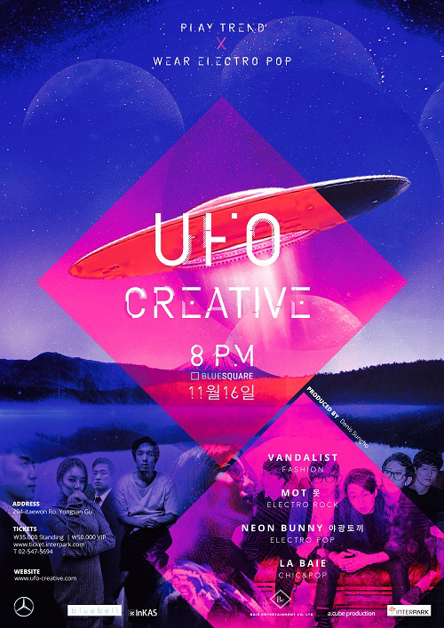 어두우면서도 섬세한 사운드와 신비로운 서정성으로 모던 록과 재즈, 일렉트로니카의 경계를 허무는 음악을 펼쳐 보이고 있는 밴드 못, '시크-팝(Chic pop)'을 키워드로 한국과 유럽의 감성이 합쳐진 새로운 음악 트렌드를 지향하는 밴드 라베이, 몽환적인 일렉트로닉팝으로 인기있는 야광토끼의 임유진까지 각 팀의 퍼포먼스 또한 기대되는 요소다. 'UFO-크레이티브'는 그 동안 볼 수 없었던 패션쇼와 일렉트로팝의 경계가 허물어진 새로운 쇼로 많은 관심과 기대를 모은다. 공연티켓은 인터파크 티켓을 통해서 구매할 수 있다.