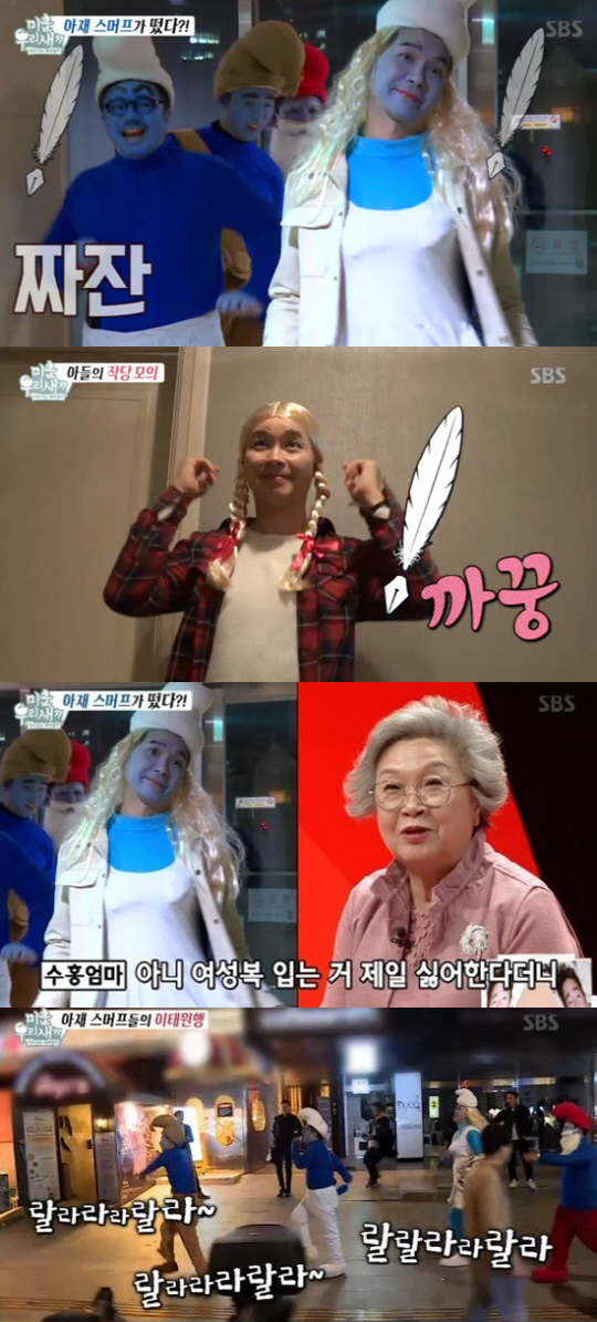 손헌수는 한 가득 스머프 분장 준비물을 가지고 등장했고, 박수홍 등은 가발을 쓰고 노래를 부르며 축제 준비를 했다.