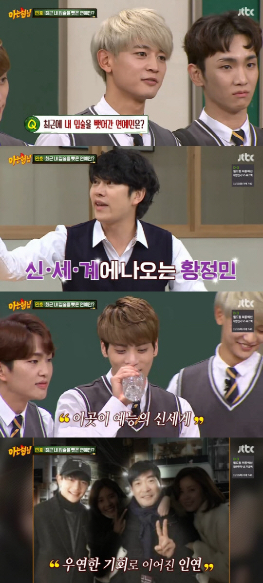 이에 김희철은 "촬영하다가 한 거 아니지 않냐"며 "민호가 배우분들한테도 인기가 좋다"고 말했다. 이어 "신·세·계에 나오는 황정민"이라고 외쳤다.