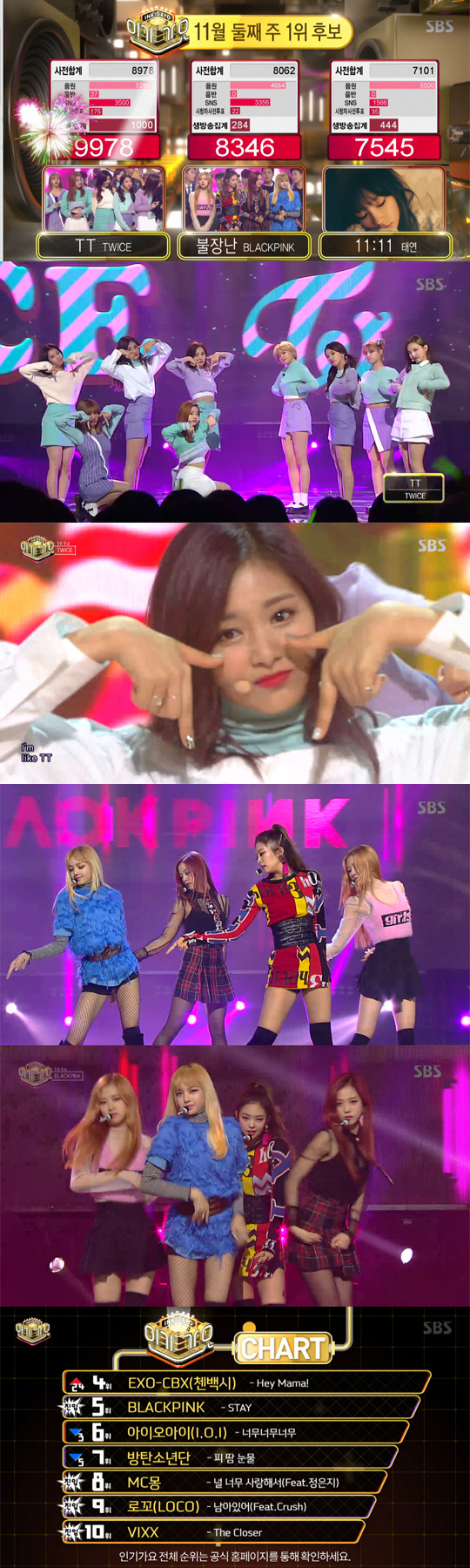 13일 SBS 인기가요에서 트와이스의 'TT'는 블랙핑크의 '불장난', 태연의 '11:11'을 누르고 1위에 올랐다.