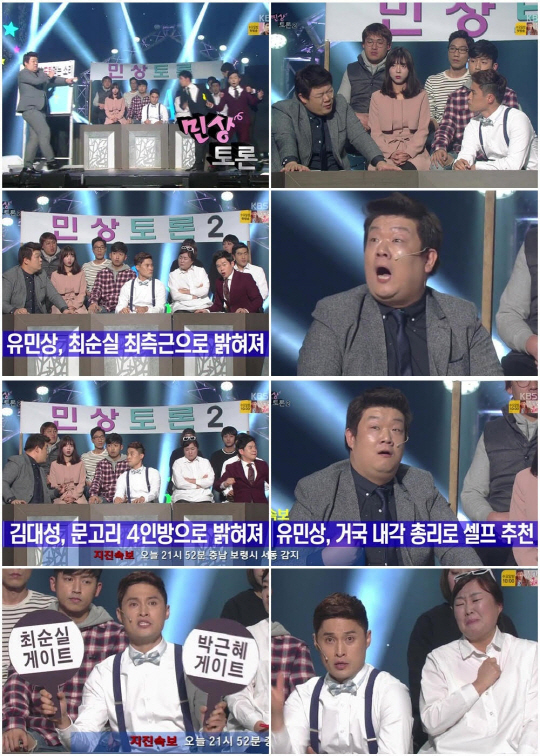 새롭게 '민상토론2'의 진행을 맡은 송준근은 비선실세 최순실로 인해 정국이 혼란에 빠진 상황을 짚어보겠다며 유민상과 김대성에게 질문 공세를 퍼부었다.