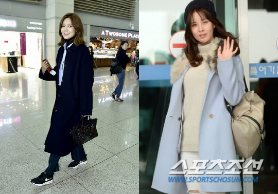 단정한 느낌의 원 컬러 롱 코트는 언제나 여성들에게 사랑받는다. 소녀시대 수영과 서현은 인천공항에서 느낌있는 공항패션 스타일링을 연출했다.