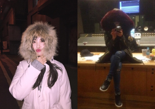 보라는 안 쪽에 밝은 오렌지 컬러의 퍼 트리밍이 가미된 야상 점퍼를 이용해 코디를 완성했다. 블랙 컬러의 티셔츠와 핫팬츠를 매치했으며, 혜리는 블랙 페이크 레더 항공점퍼로 무난하고 캐주얼한 느낌의 데일리 룩을 완성했다.