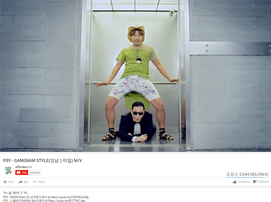 '넘사벽' 싸이의 '강남스타일'은 단 40시간만에 5000만 뷰, 9일 만에 2억 뷰를 기록한 바 있다. 싸이는 강남스타일-젠틀맨-오빤딱내스타일-행오버-대디까지 5곡 모두 2억뷰를 넘겼으며, 그중 강남스타일과 젠틀맨은 10억뷰를 넘겼다. 강남스타일은 유튜브 전체 조횟수 1위 곡이기도 하다.