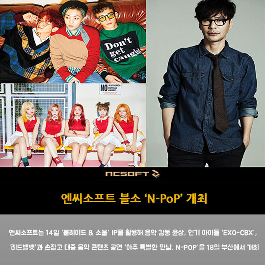 엔씨소프트는 14일 '블레이드 & 소울' IP를 활용해 음악 감동 윤상, 인기 아이돌 'EXO-CBX','레드벨벳'과 손잡고 대중 음악 콘텐츠 공연 '아주 특별한 만남, N-POP'을 18일 부산에서 개최