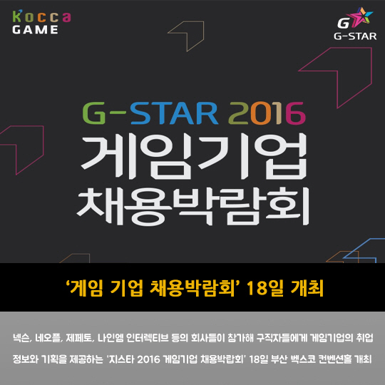 넥슨, 네오플, 제페토, 나인엠 인터렉티브 등의 회사들이 참가해 구직자들에게 게임기업의 취업 정보와 기획을 제공하는 '지스타 2016 게임기업 채용박랍회' 18일 부산 벡스코 컨벤션홀 개최