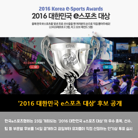 한국e스포츠협회는 23일 개최되는 '2016 대한민국 e스포츠 대상'의 우수 종목, 선수, 팀 등 부문별 후보를 14일 공개하고 금일부터 유저들이 직접 선정하는 인기상 투표 실시