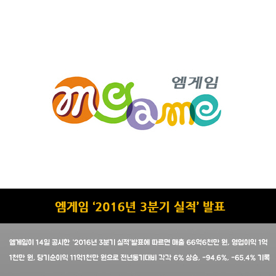 - 엠게임 '2016년 3분기 실적' 발표