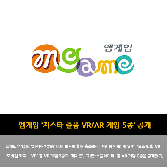 엠게임은 14일 '지스타 2016' 야외 부스를 통해 출품하는 '프린세스메이커 VR', '우주 탐험 VR', '모바일 카지노 VR' 등 VR 게임 3종과 '캐치몬', '귀혼-소울세이버' 등 AR 게임 2종을 공개했다.