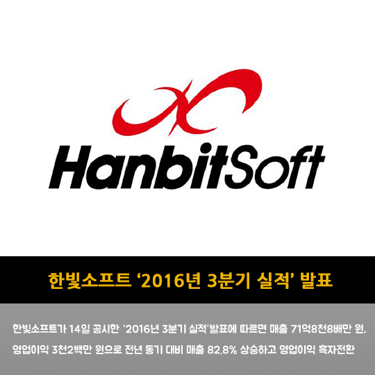 한빛소프트가 14일 공시한 '2016년 3분기 실적'발표에 따르면 매출 71억8천8배만 원, 영업이익 3천2백만 원으로 전년 동기 대비 매출 82.8% 상승하고 영업이익 흑자전환