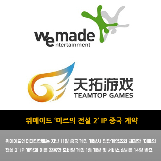 위메이드엔터테인먼트는 지난 11일 중국 게임 개발사 팀탑게임즈와 체결한 '미르의 전설 2' IP 계약과 이를 활용한 모바일 게임 1종 개발 및 서비스 실시를 14일 발표